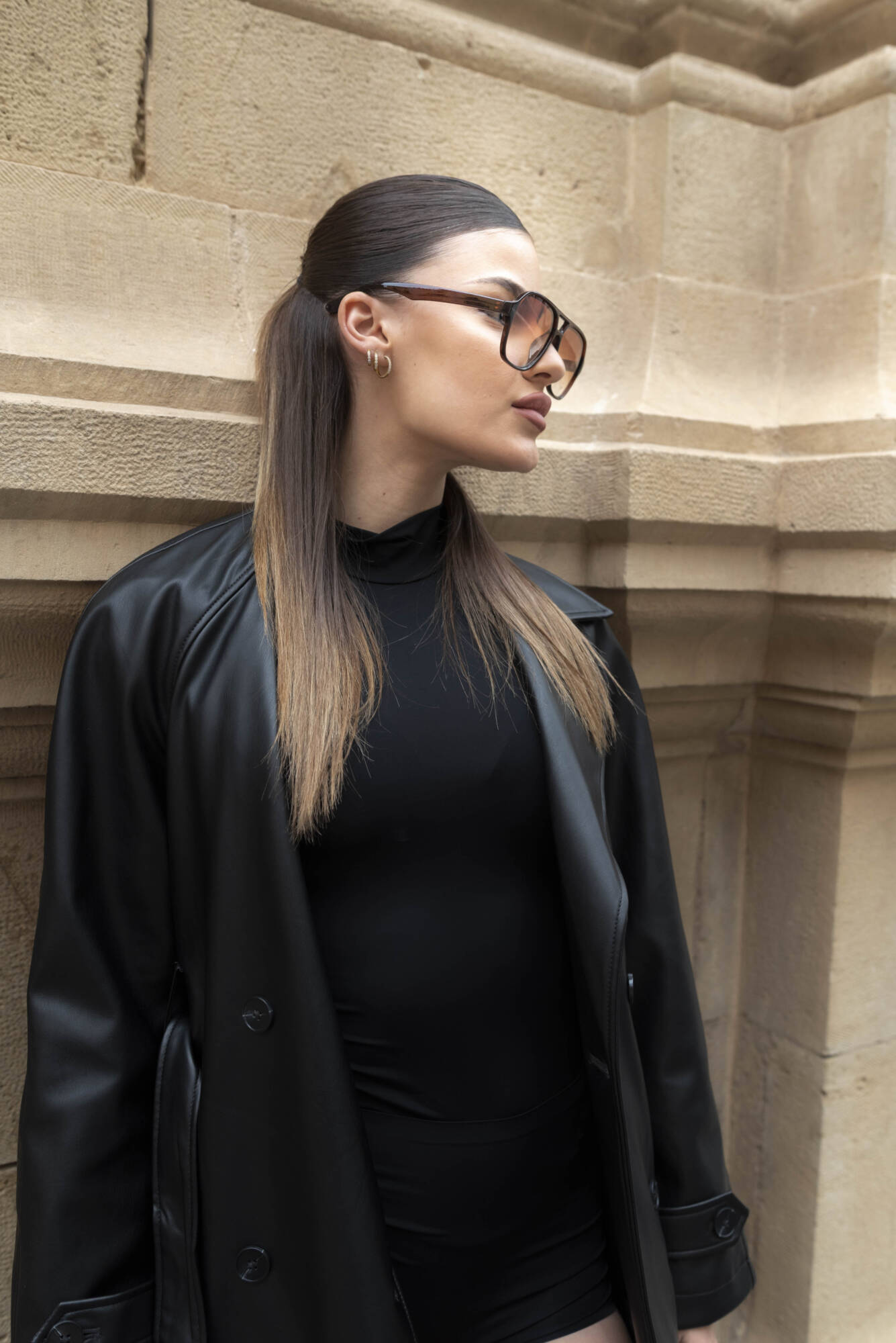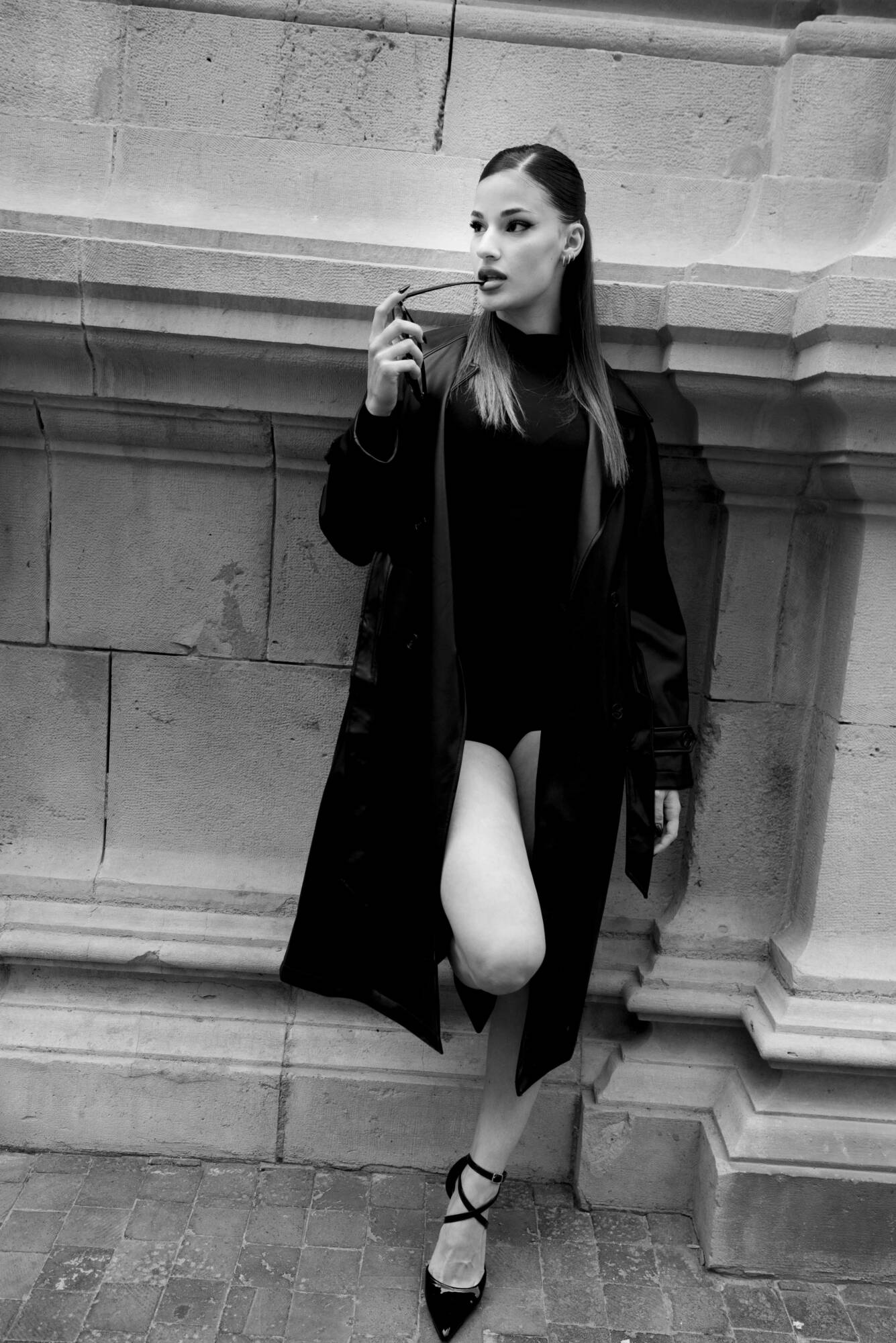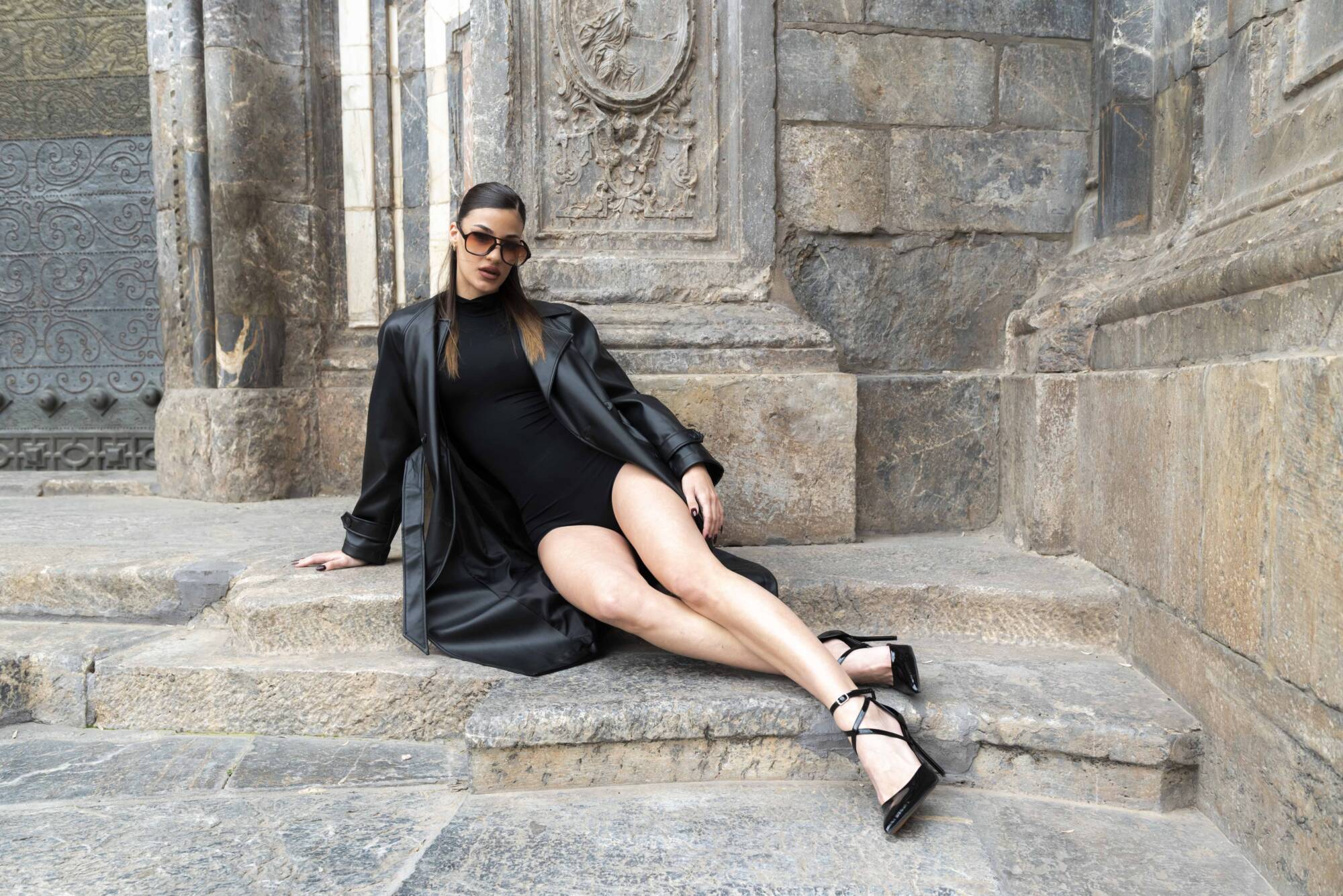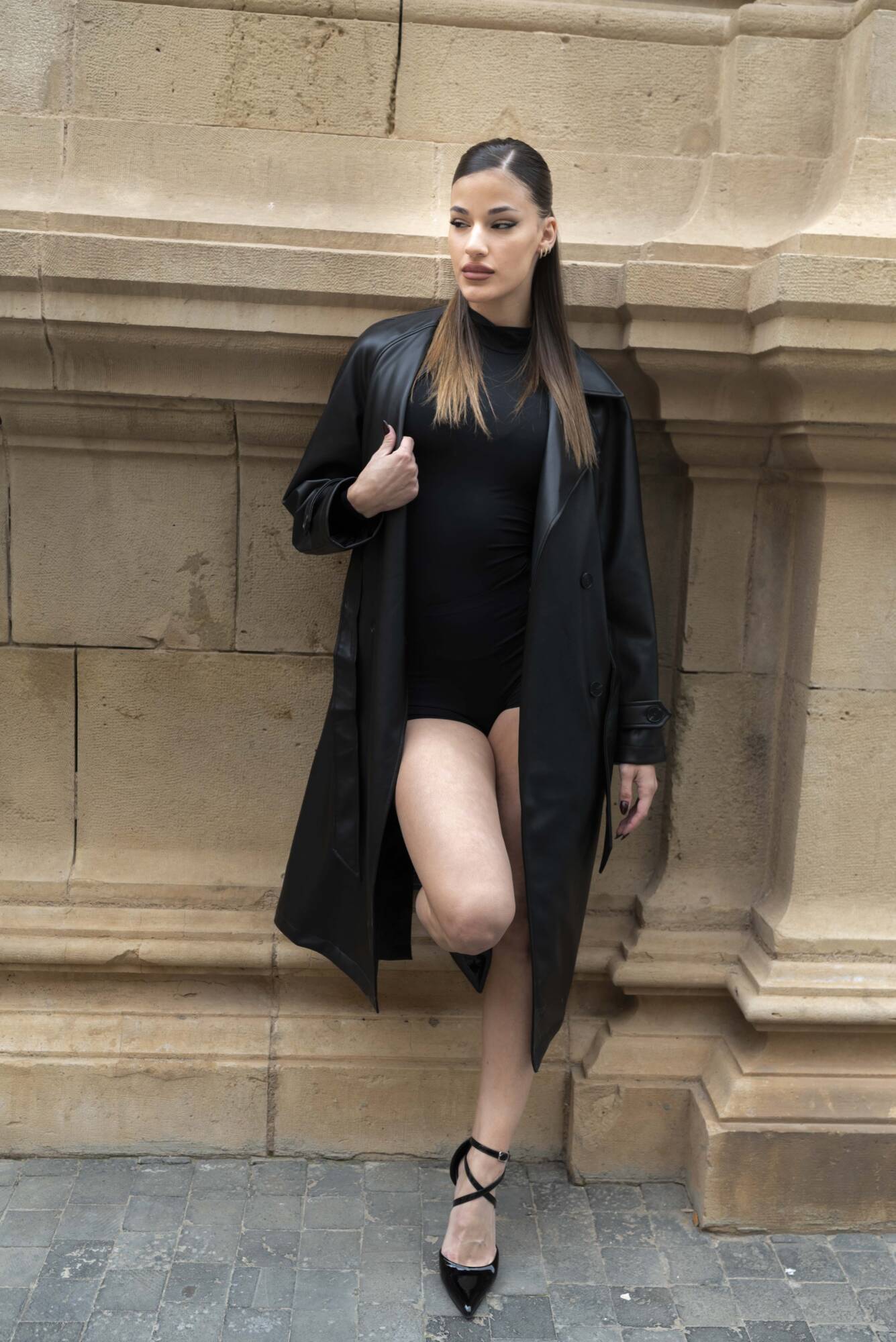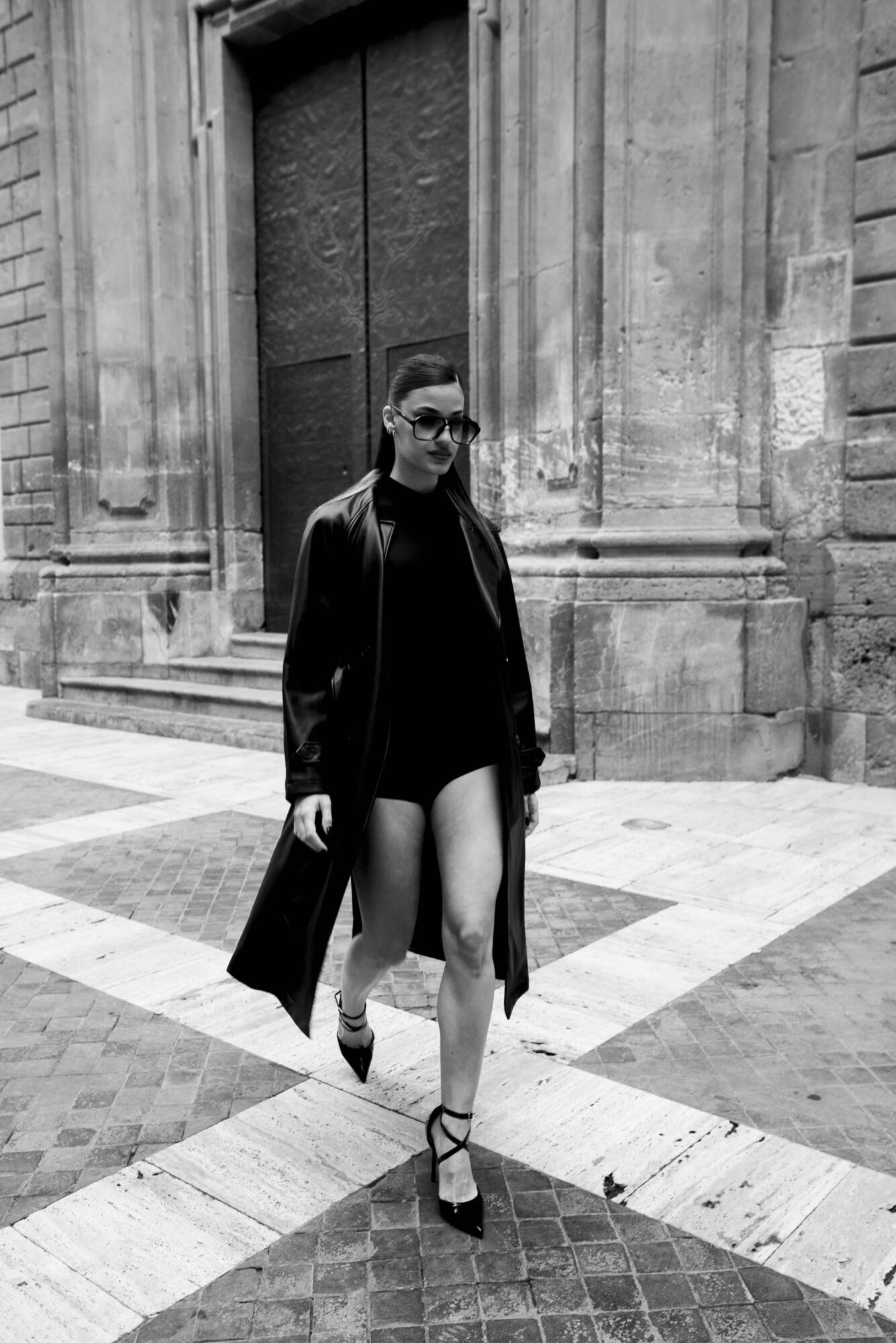 La piedra centenaria, testigo de siglos de historia, contrasta con su presencia moderna y magnética. Marta no solo atraviesa el espacio: lo redefine. Su silueta, envuelta en negro, corta el aire con elegancia, como si cada paso marcara un ritmo propio en medio del silencio arquitectónico.