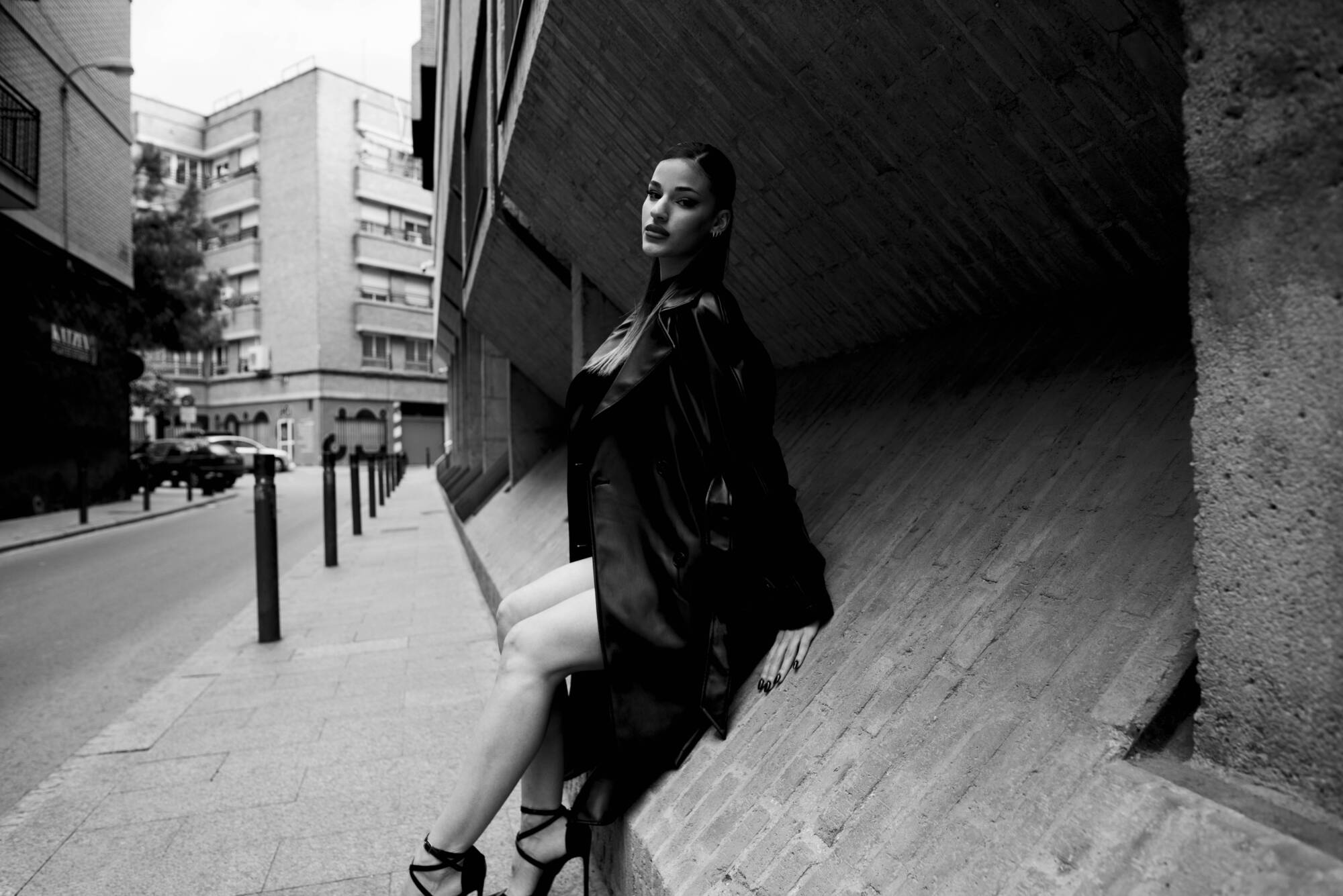 Después, el entorno cambia. La estructura metálica y urbana dialoga con su estilo minimalista. Marta observa, se detiene, analiza. Ya no es solo movimiento: es actitud. Es la pausa entre dos momentos, donde la ciudad respira y ella la observa desde su propia narrativa.