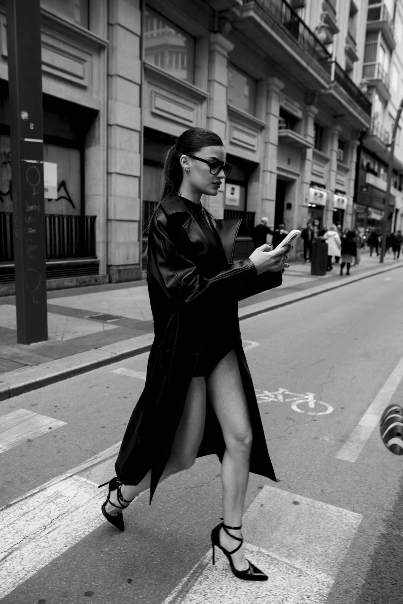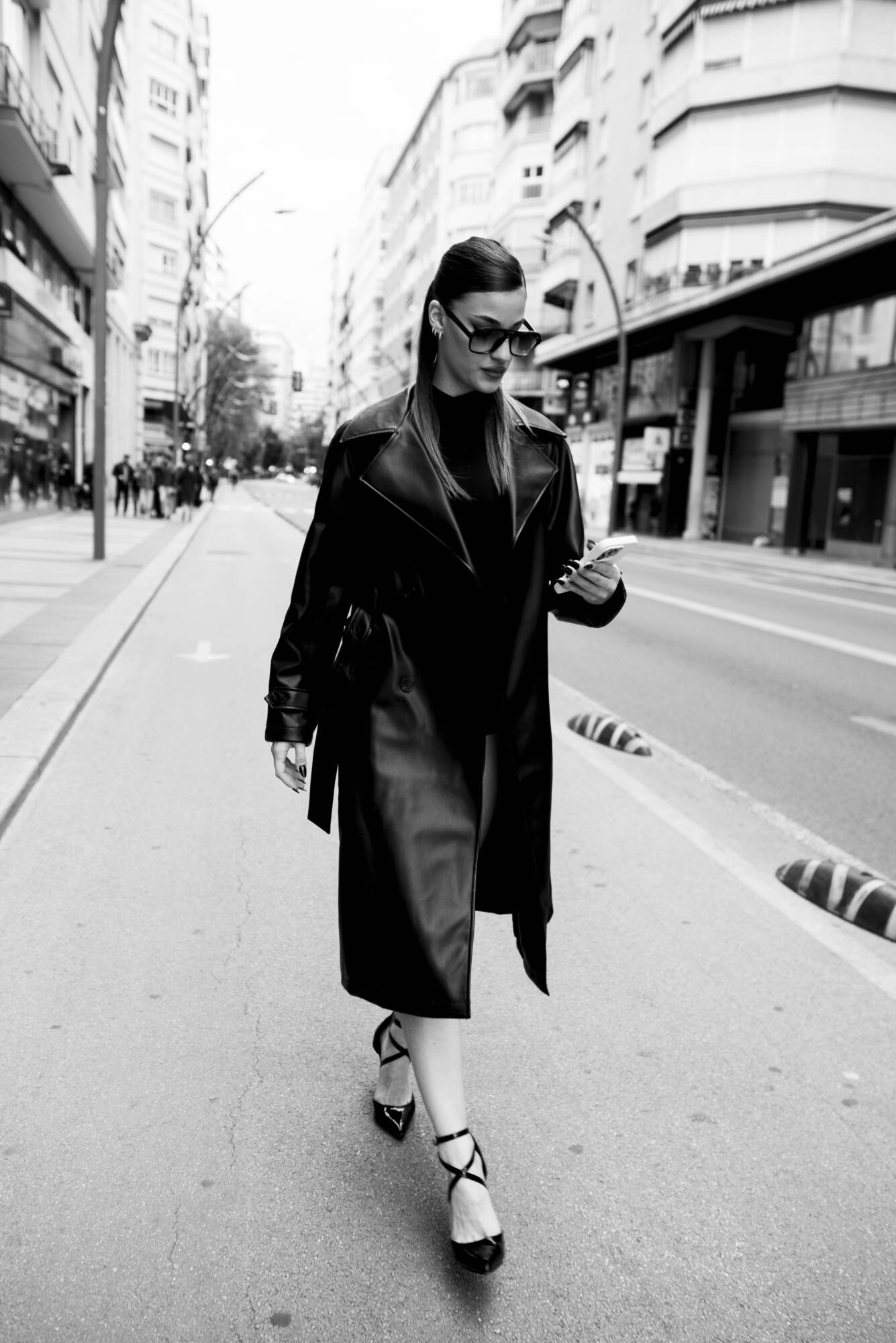 En la primera escena, avanza con determinación. La ciudad queda en segundo plano; ella es el foco. Hay algo casi cinematográfico en su forma de caminar, como si conociera un secreto que el resto aún no ha descubierto.