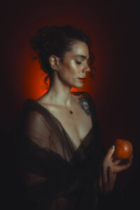 En esta obra, la figura emerge desde un fondo rojo profundo, envuelta en una atmósfera de introspección y deseo contenido. La manzana, sostenida con delicadeza, evoca el símbolo eterno de la tentación, reinterpretado desde una mirada contemporánea e íntima. A su vez, la manzana también se presenta como un emblema de salud y vida, generando un diálogo sutil entre el deseo y el bienestar.
